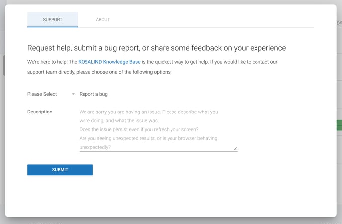 Navigate to the area in ROSALIND where you need assistance, and then click the '?' mark to submit a support ticket: