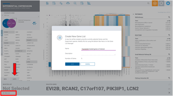 You can create a gene list of all genes of interest within an experiment. Select all genes of interest by holding the Ctrl or Command key. Once all genes are selected, a 'list' tab will appear in the bottom tab. From here, select "+ New List" to save the list.