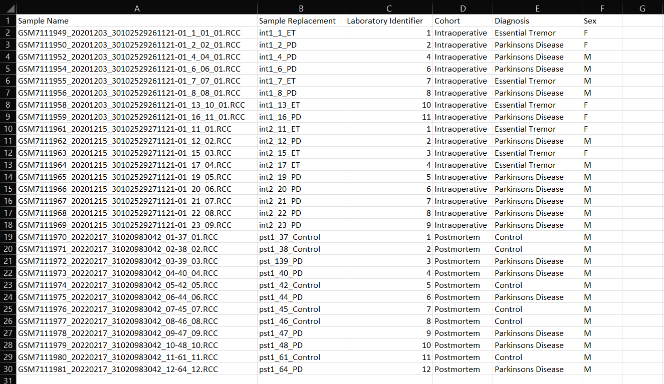 A) Sample Name: This column contains the exact RCC file names. Do not edit this column as ROSALIND uses this column to locate the RCC files and associate them with the appropriate samples.